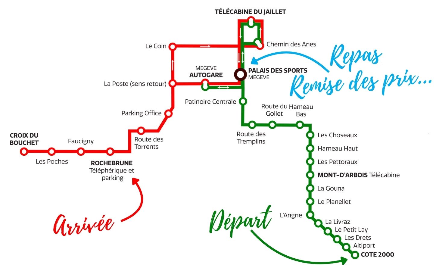 – Entre Rochebrune (zone arrivée) et Le Palais (espace douches / repas) : de 18h30 à 22h